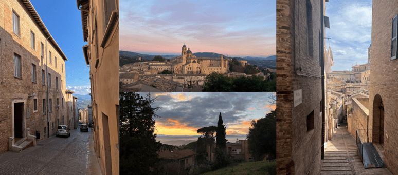 2025 szeptemberének elején érkeztem meg. Az utazás nem volt a legegyszerűbb: Bologna városába repültem, onnan körülbelül kétórás vonatút után Pesaro városából még egy órát kellett buszoznom, hogy megérkezzem Urbinóba. A hosszú út azonban azonnal feledésbe merült, amikor megláttam a várost, hiszen Urbino egy hegy tetején fekszik, és bármerre néz az ember, gyönyörű dombok és hegyek veszik körül.